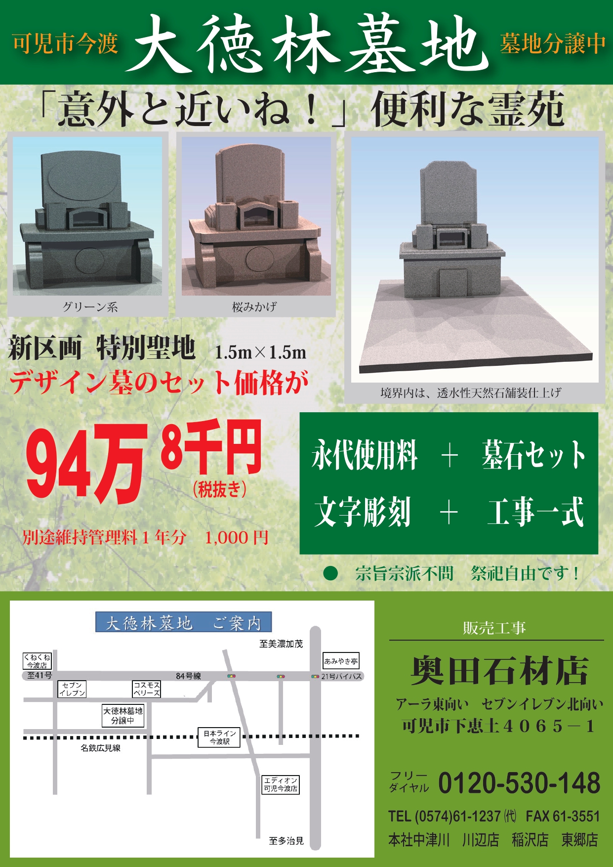 中津川市・恵那市・瑞浪市・土岐市・多治見市の東農地域と可児市・美濃加茂市・関市・加茂郡の中濃地域などの岐阜県、小牧市・稲沢市・春日井市・みよし市などの愛知県を中心とした墓石をメインとした石材店です。